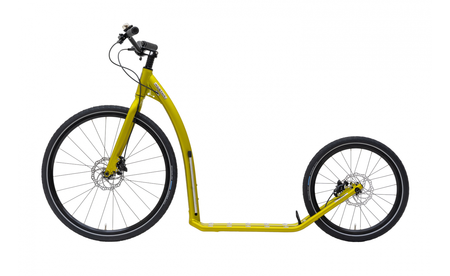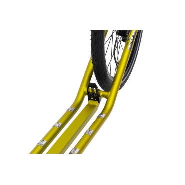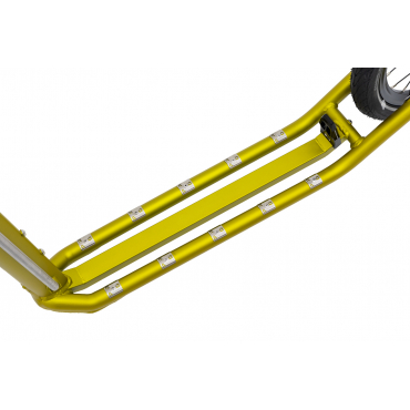 Integrovaný otvor pro stojánek, přední výztuha, speciálními sváry pro zvýšení tuhosti a odolnosti rámu při kontaktu s nerovností jsou již standardem, na který jsme právem pyšni. Zapuštěná osa zadního kola zabraňuje kontaktu odrazové nohy s koloběžkou, což pozitivně ovlivňuje celkový jízdní komfort. Nerezové adhezní prvky na horní straně stupátka zajišťují dlouhodobou životnost nášlapné plochy a protiskluzové vlastnosti.